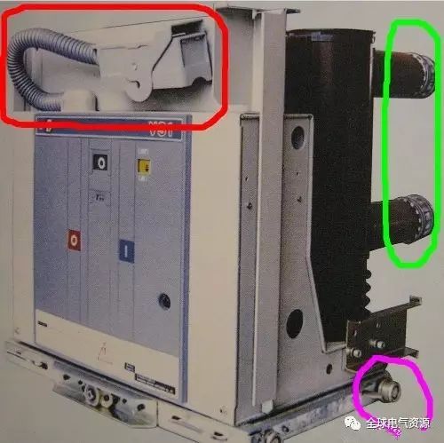 圖2顯示了VS1斷路器手車,它像抽屜一樣放置在開關柜位置。軌道上的滑輪在紫色的盒子里,二次連接插頭(處于未插好的狀態)在紅色的盒子里,斷路器的動觸頭在綠色的盒子里。圖3中框架內的設備與圖2中的相同,二次接線插頭處于插入位置。