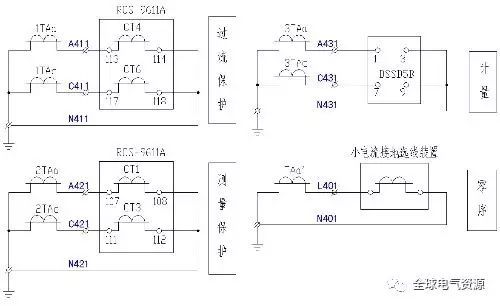 圖8顯示了電流回路,包括:保護、測量、計量和小電流接地線選擇。保護裝置和電能表安裝在開關柜上,所有接線均由開關廠連接。小電流接地選線裝置安裝在主控室,零序電流L401和N400需要通過控制電纜連接到該裝置。