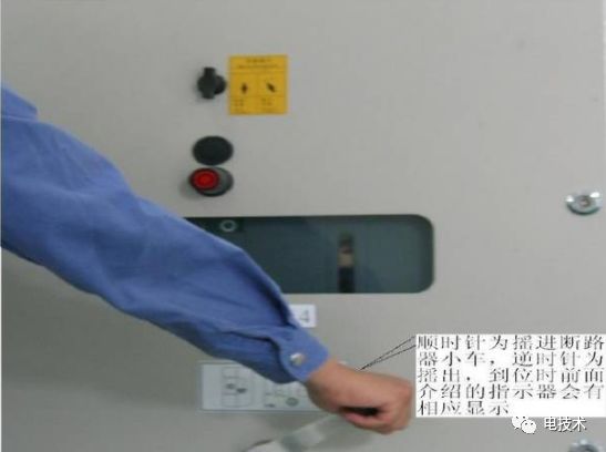4.將斷路器手車的搖把插入搖把插座,順時針轉動搖把約20圈。當曲柄明顯堵塞并伴有咔嗒聲時,取下曲柄。此時,手車處于工作位置,二次插頭鎖定,斷路器手車主電路接通,并檢查相關信號。