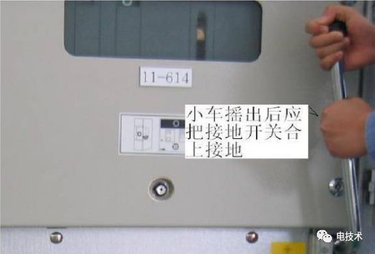 5.將接地開關的操作手柄插入中間門右下側的六角孔中,順時針旋轉使接地開關處于關閉位置。確認接地開關已經關閉后,打開機柜的下門,以便維護人員可以進入維護和檢修。
