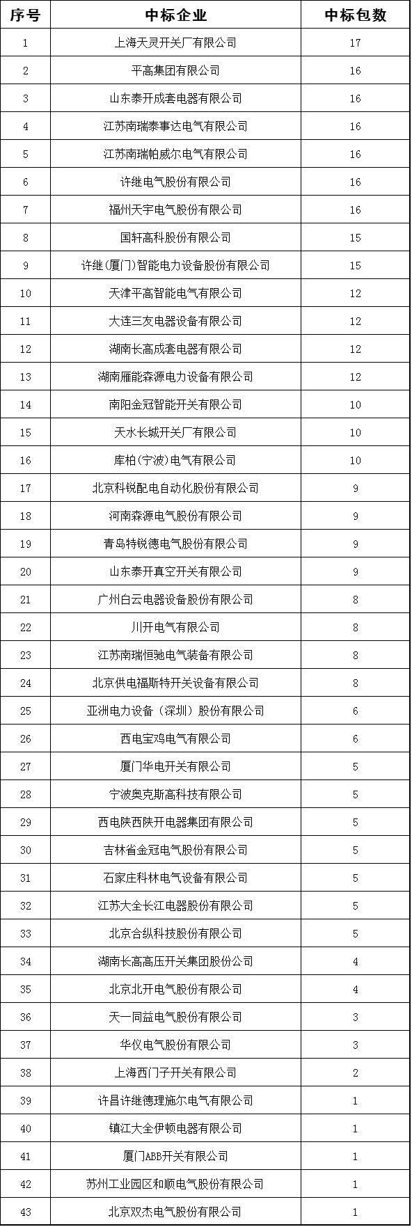 中標的還有上海田零開關廠有限公司、江蘇南瑞泰時代電氣有限公司、庫珀(寧波)電氣有限公司、福州天宇電氣有限公司、天津高萍智能電氣有限公司、郭萱高科有限公司、江蘇大全長江電氣有限公司、廈門華電開關有限公司、江蘇南瑞帕威爾電氣有限公司、廣州白云電氣設備有限公司、西電寶雞電氣有限公司、青島特立尼達電氣有限公司、天同一電氣有限公司、山東泰凱真空開關有限公司和廈門ABB