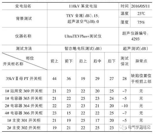 2016年5月11日,當操作人員檢查一個110千伏變電站35kV的高壓室時,他們聽到輕微的間歇放電噪音。通知維護人員后,測試人員趕到現場,使用了UltraTEVPlus+測試儀。對電壓為11+35千伏和0+的110千伏高壓室進行了瞬態地電壓試驗(TEV)和超聲波局部放電試驗(兩種檢測方法的數據如下表所示)。