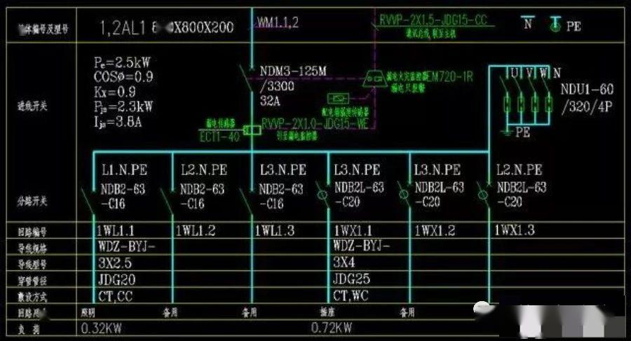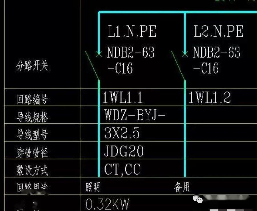 L1。并聯開關上方的N.PE指的是采用一路帶電導線,即三項中的一項,加上零線和地線,形成一個1WL1.1回路,電源電壓為220伏。導線規格WDZ-BYJ-3X2.JDG20-CT,CC指低煙無鹵阻燃交聯聚乙烯絕緣(銅芯)導線,3根2.5平方毫米,直徑20毫米的金屬管,橋架及沿屋面暗敷設。同時,標記該回路用于照明和備用。照明負載為0.32千瓦,相對較小。